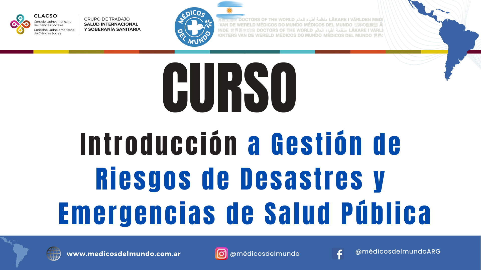 El presente de Curso introductorio tiene por objetivo fortalecer capacidades en estrategia de Gestión Integral de Determinantes y Riesgos de Desastres socioambientales y Respuesta ante Emergencias de Salud Pública para Argentina. A su vez, como objetivos específicos de trabajo busca: 1. Construir espacios nacionales de formación de Equipos con capacidades técnicas y de intervención a nivel territorial-comunitario en Gestión de riesgos de Desastres y Emergencias de salud pública; 2. Desarrollar la construcción de redes inter-institucionales y sistemas comunitarios de prevención, preparación y respuesta ante Emergencias de Salud Pública priorizando la alerta temprana. Este Curso es parte del programa de formación de Voluntariado de Médicos del Mundo ARG con el soporte pedagógico del Programa de Salud Internacional de CLACSO (Consejo Latinoamericano de Ciencias Sociales)
